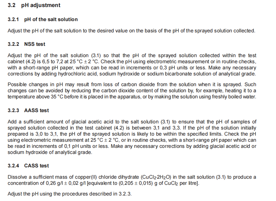 ● 溶液浓度和pH值,在每个试验之前都要检验溶液浓度和pH值(ISO9227,ASTM B117标准有检验pH值的建议程序);