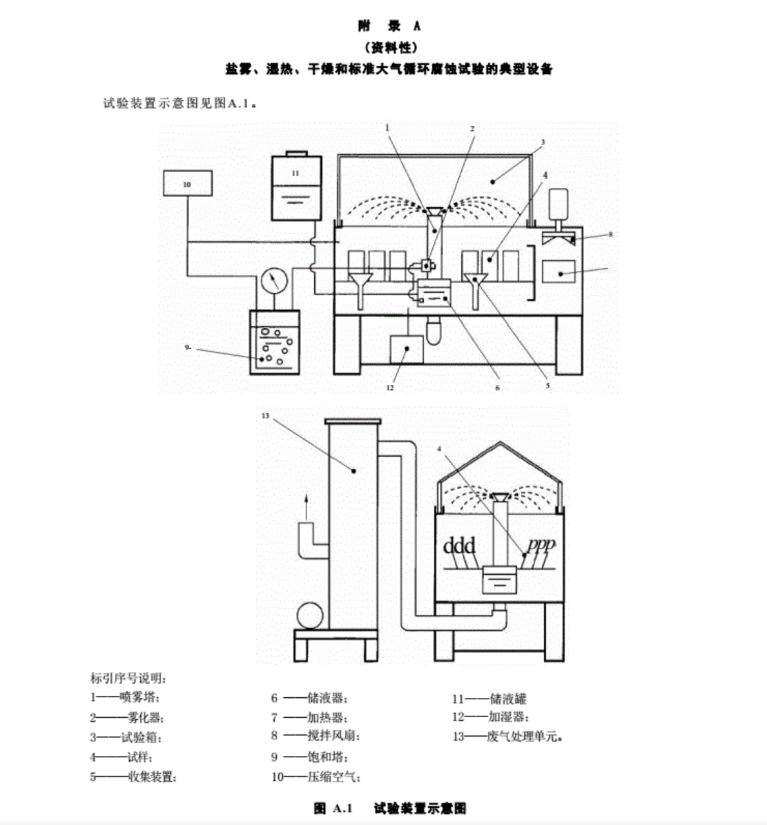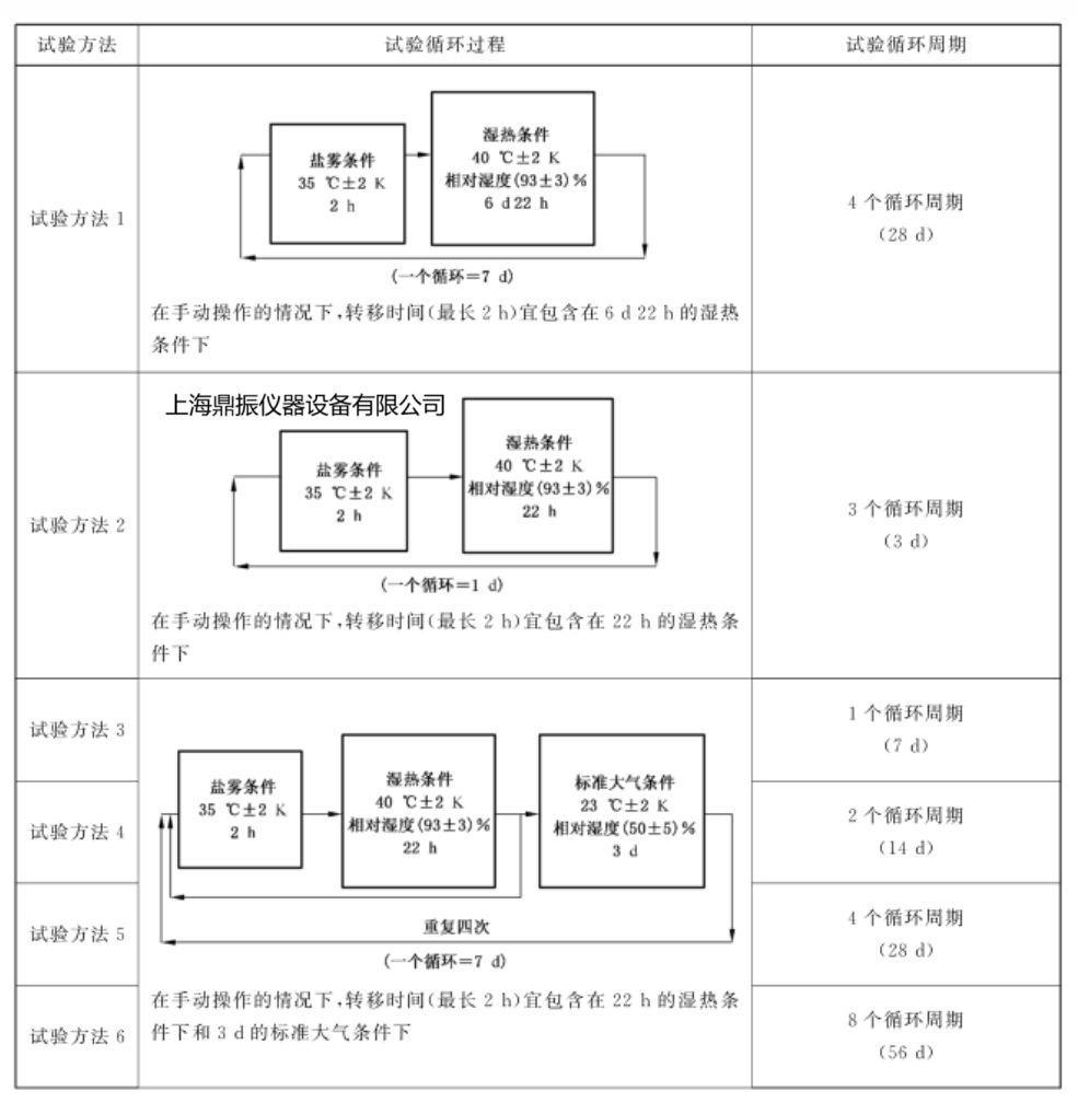 一个循环是7 d。一个循环应包括在35 ℃±2K条件下,用盐溶液喷洒试验样品2 h, 然后在40℃+2 K、相对湿度(93±3)%的湿热条件下贮存6 d 22 h。循环数为四个循环(28 d)。在手动操作的情况下,转移时间(*长2 H)宜包含在湿热条件的6 d22 h。
