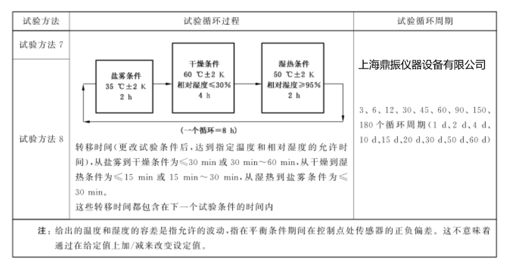 一个循环是8 h。一个循环应包括在35℃±2K条件下,用盐溶液喷洒试验样品2 h, 接着在60℃±2 K、相对湿度≤30%的干燥条件下保持4 h, 然后在50℃±2K、相对湿度≥95%的湿热条件下保持2h。温度和湿度的过渡时间(改变试验条件后,达到指定温度和相对湿度的允许时间)应从以下条件中选定: